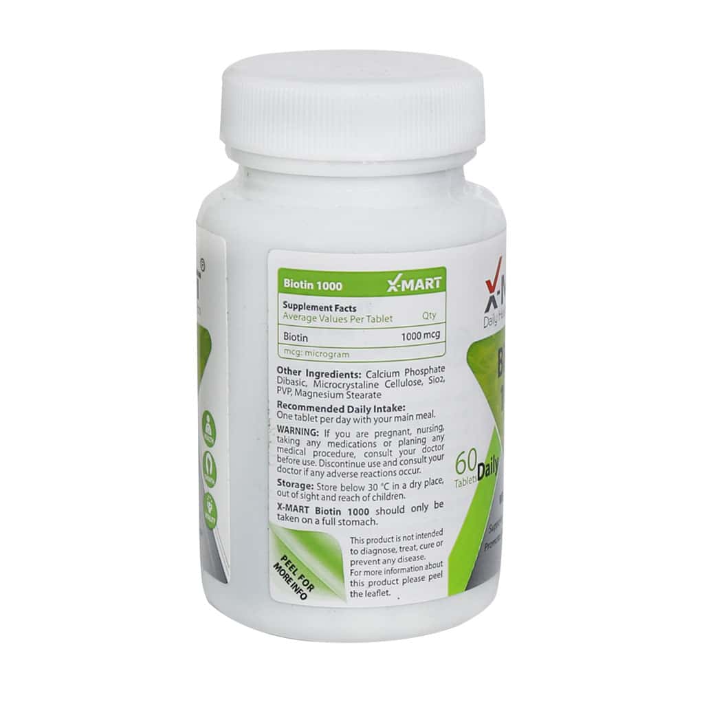 قرص بیوتین ۱۰۰۰ ایکس مارت حاوی ۱۰۰۰ میکروگرم بیوتین در هر قرص است. این مکمل به شما در داشتن موهای سالم با رشد طبیعی، پوستی درخشان و ناخنهای قوی کمک میکند. بیوتین این کار را از طریق شرکت در ساختن پروتئینها و کراتین انجام میدهد و با توجه به در دسترس بودن، مقرون به صرفه بودن و فروش موثرش یک مکمل تغذیه ای محبوب بین مصرف کنندگان به شمار میآید. مصرف این مکمل آرزوی داشتن پوست و موی سالم و درخشان را برای شما برآورده میکند.