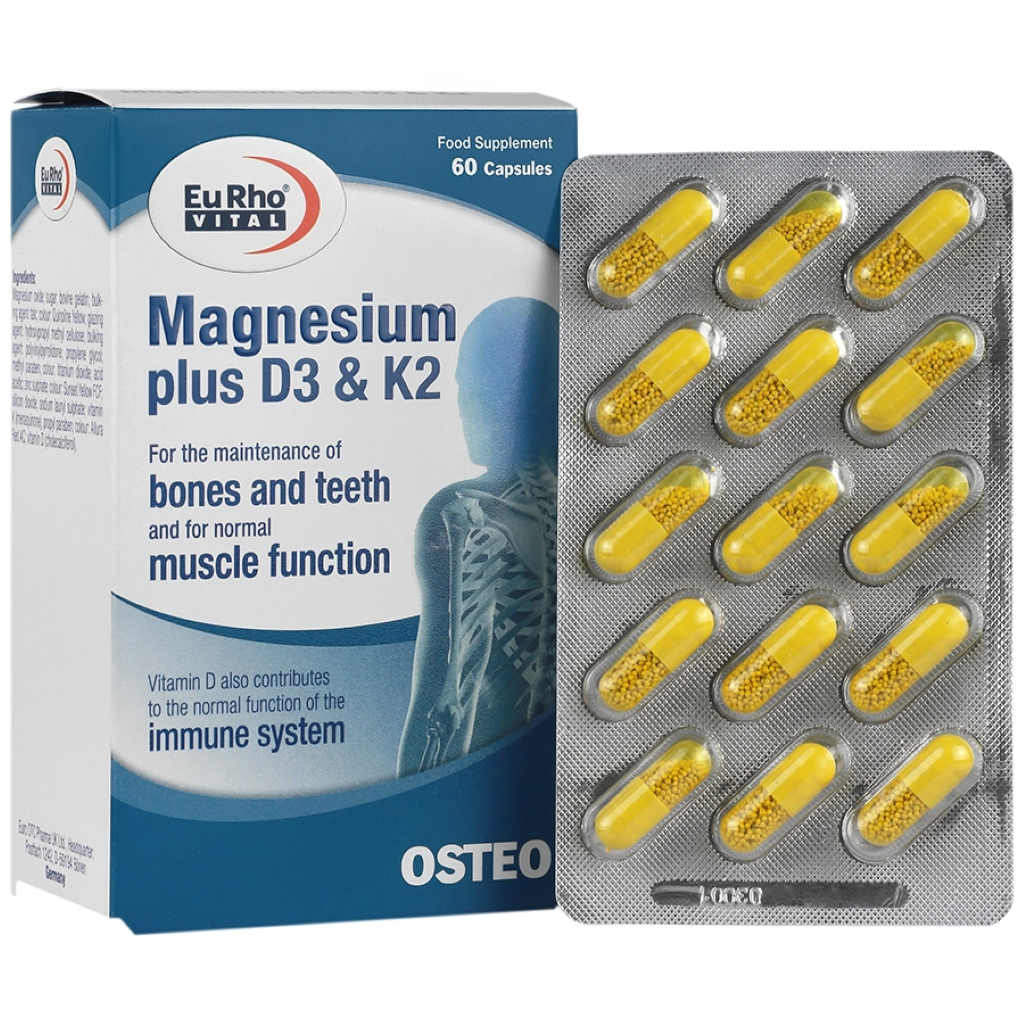 کپسول منیزیم پلاس د3 و کا2 یوروویتال حاوی 250 میلیگرم منیزیم بههمراه ویتامینهای D3 و K2 است که به افزایش سطح انرژی، حفظ سلامت استخوانها و بهبود عملکرد عضلانی کمک میکند.