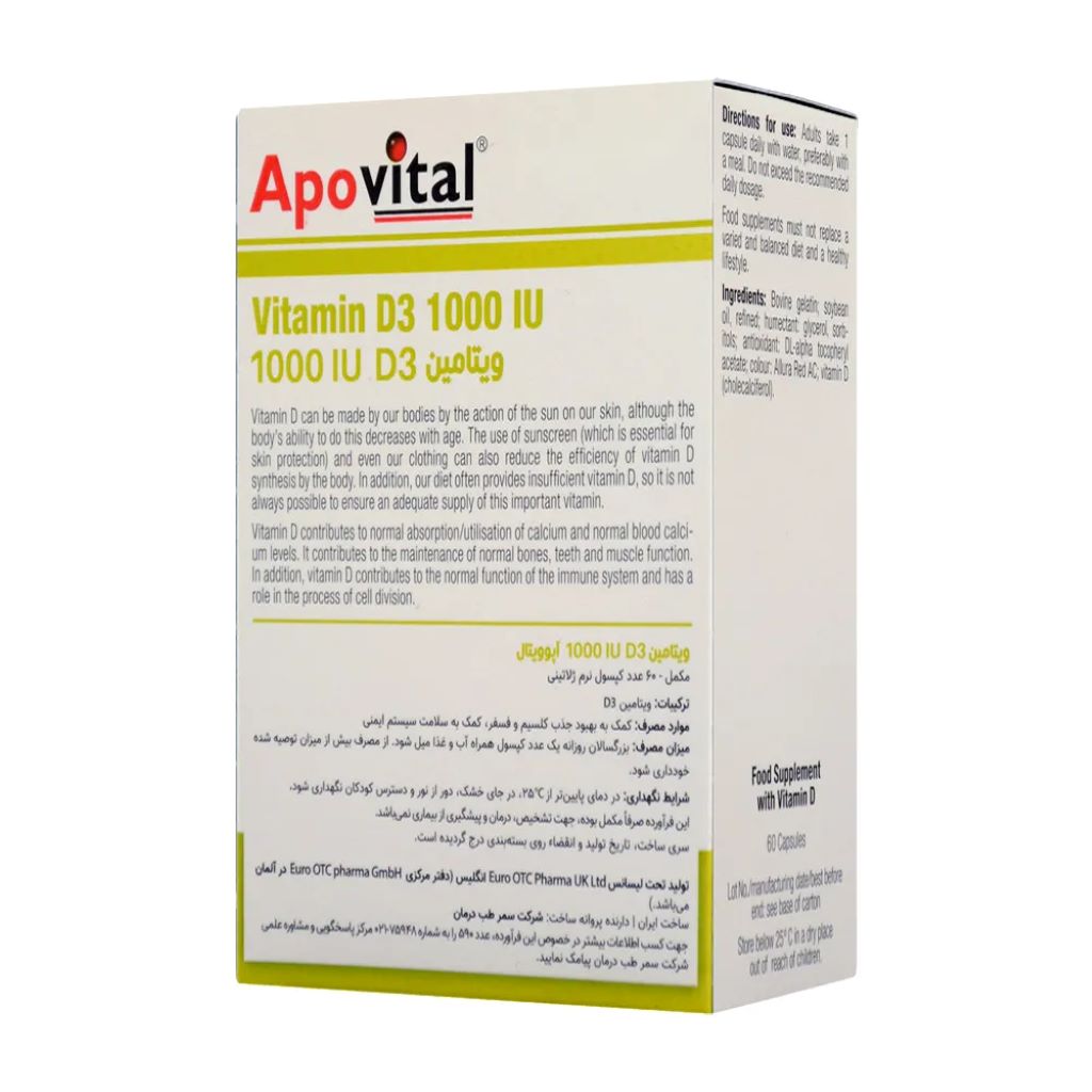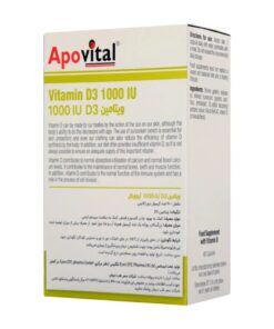 کپسول ویتامین د3 1000 آپوویتال Apovital Vitamin D3 1000IU یک مکمل ویتامین د3 برای تامین نیاز روزانه بدن به این ویتامین مهم از محصولات آپوویتال است. همانطور که در نام محصول هم پیداست، هر قرص ویتامین د3 آپوویتال حاوی 1000 واحد بین المللی (25 میکروگرم) ویتامین د3 است که حتی بیش از نیاز روزانه شما را نیز تامین می کند.